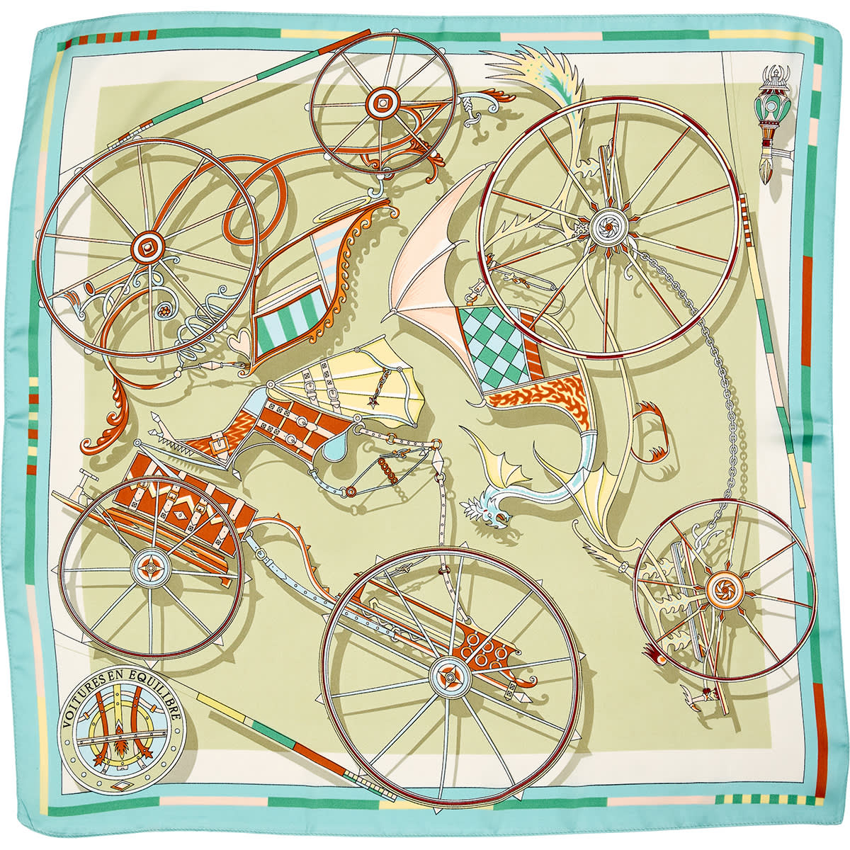 Kvadratisk tørklæde med motiv af gammeldags cykler samt ensfarvet kant.