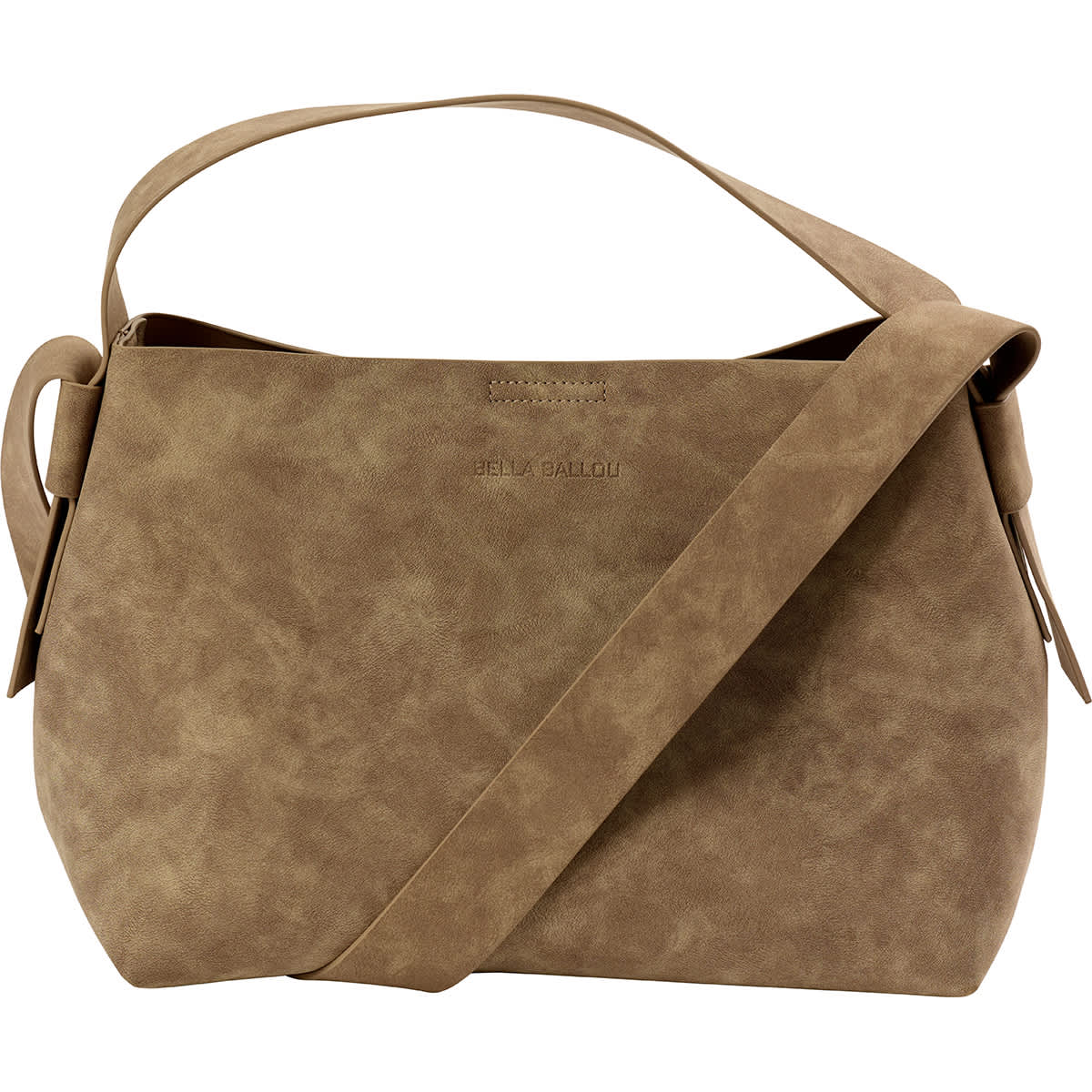 Skuldertaske i PU "ruskind" med skulderstrop, hank, 1 stort indvendigt lynlåsrum og magnetisk trykknap i toppen.