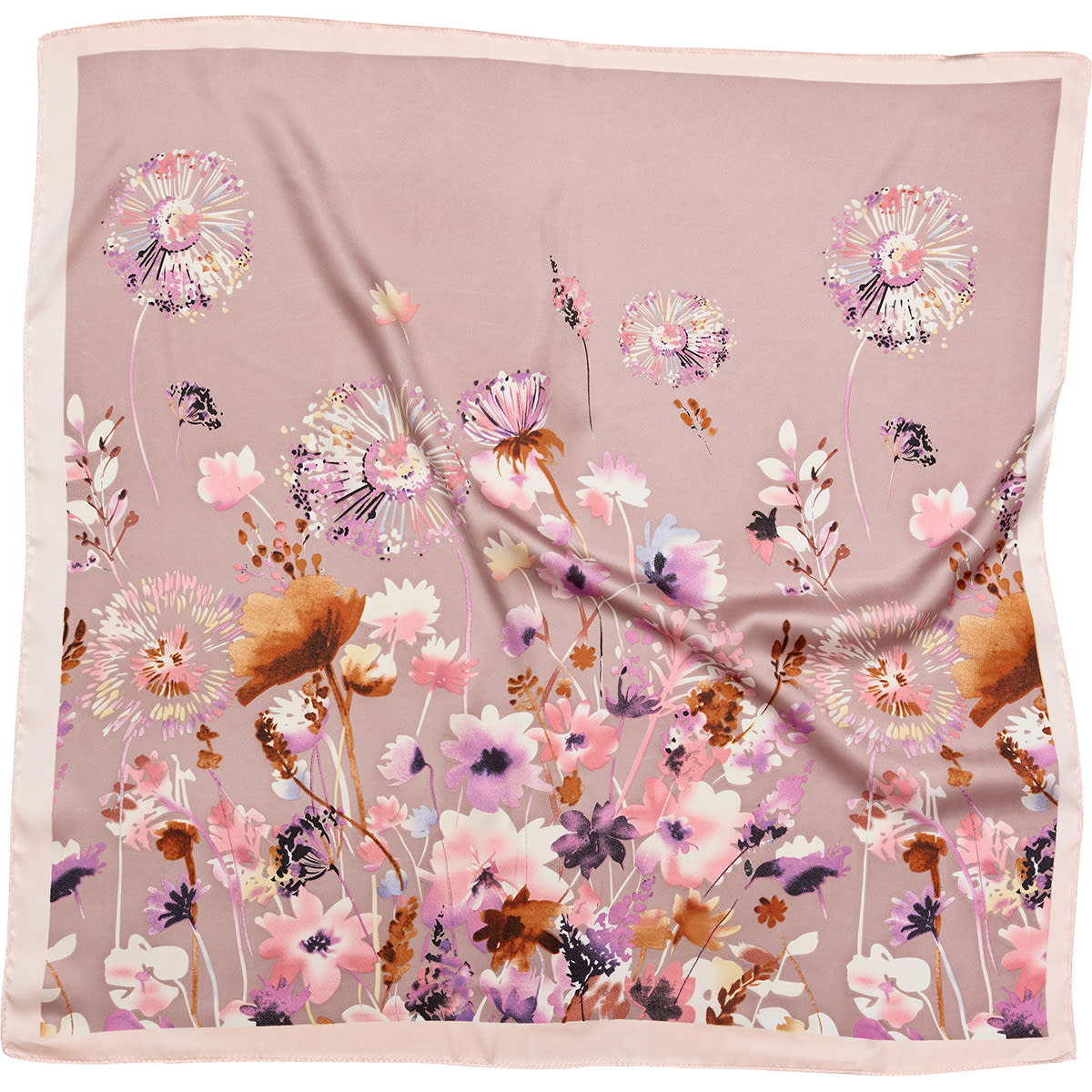 Kvadratisk tørklæde med blomster motiv og ensfarvet bund.