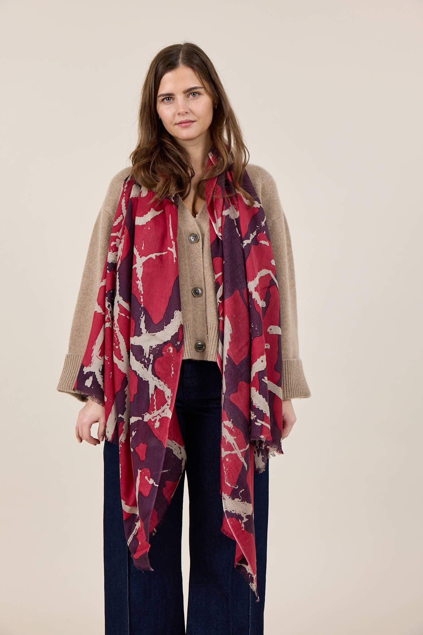 Stor avlång och bred Halsduk i en mjuk fin ull/Siden kvalitet med grafiskt mönster och råa ändar.