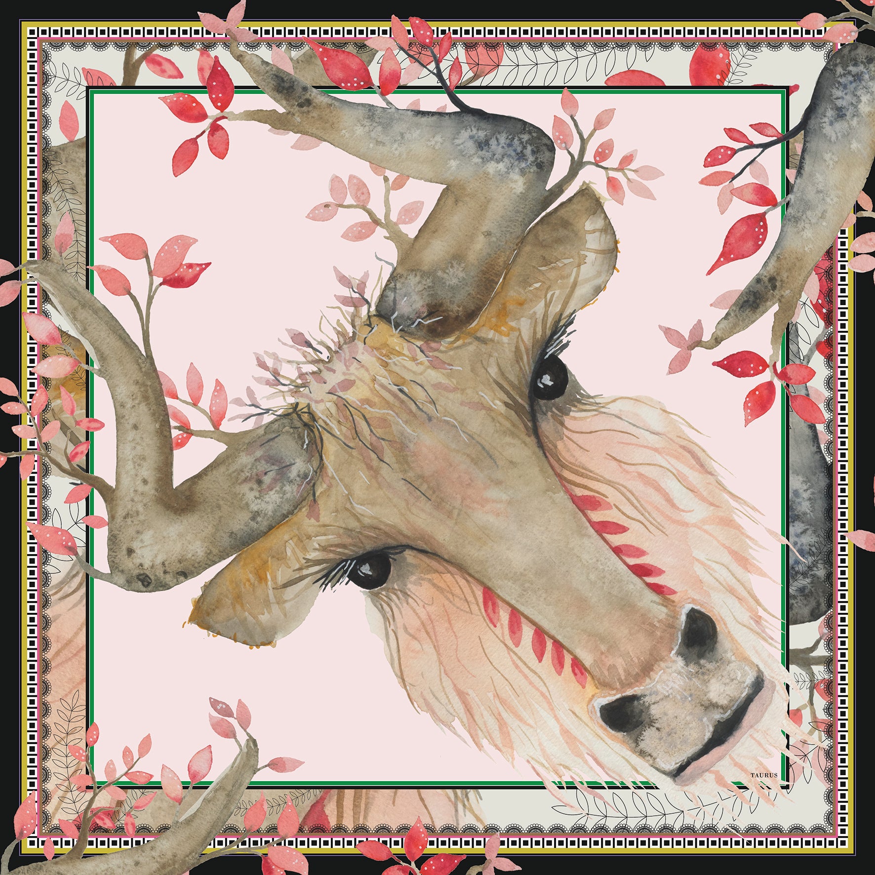 Square zodiac Silk scarf with a unique print of the Taurus in hand-painted watercolor and a graphic multicolored lace frame. Collab BELLA BALLOU & Annemette Voss