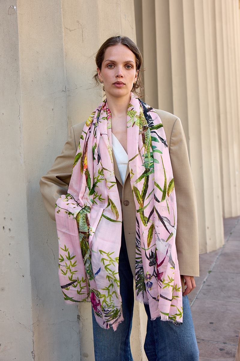 ASIAN GARDEN Skjerfet i 50% Bomull/50% har et orientalskinspirert print med frodige blomsterdetaljer, som skaper et elegant og sanselig Silkeskerf.