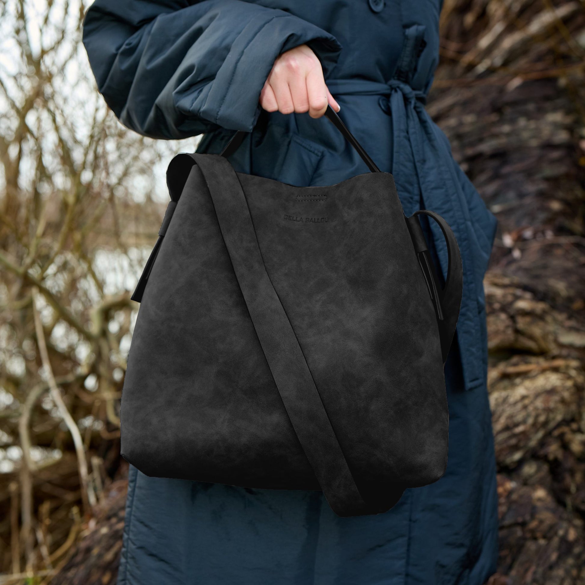 Stor skuldertaske i PU med skulderstrop, hank, 1 stort indvendigt rum og magnetisk trykknap i toppen.
