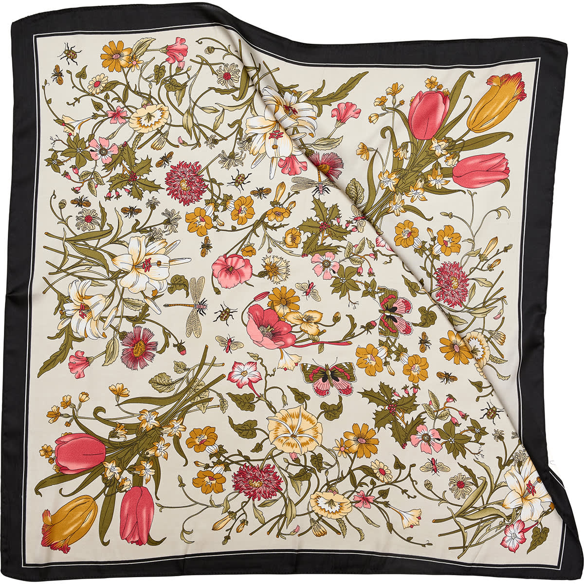 Kvadratisk skjerf med fine blomster og ensfarget kant.