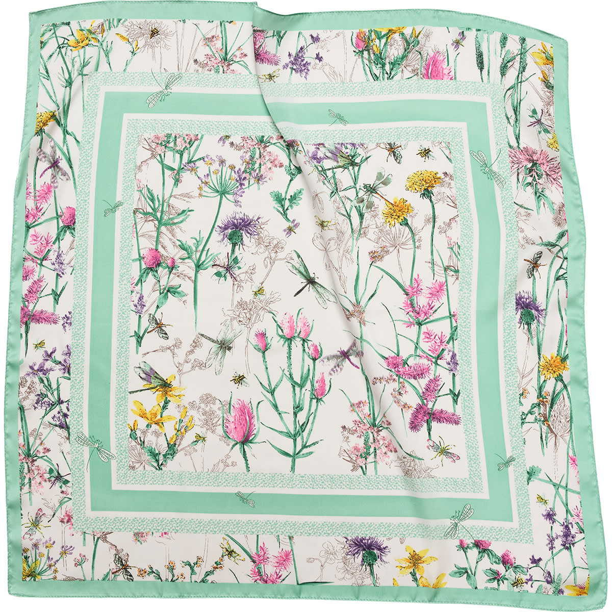 Kvadratisk tørklæde med blomster motiv og ensfarvet kant.