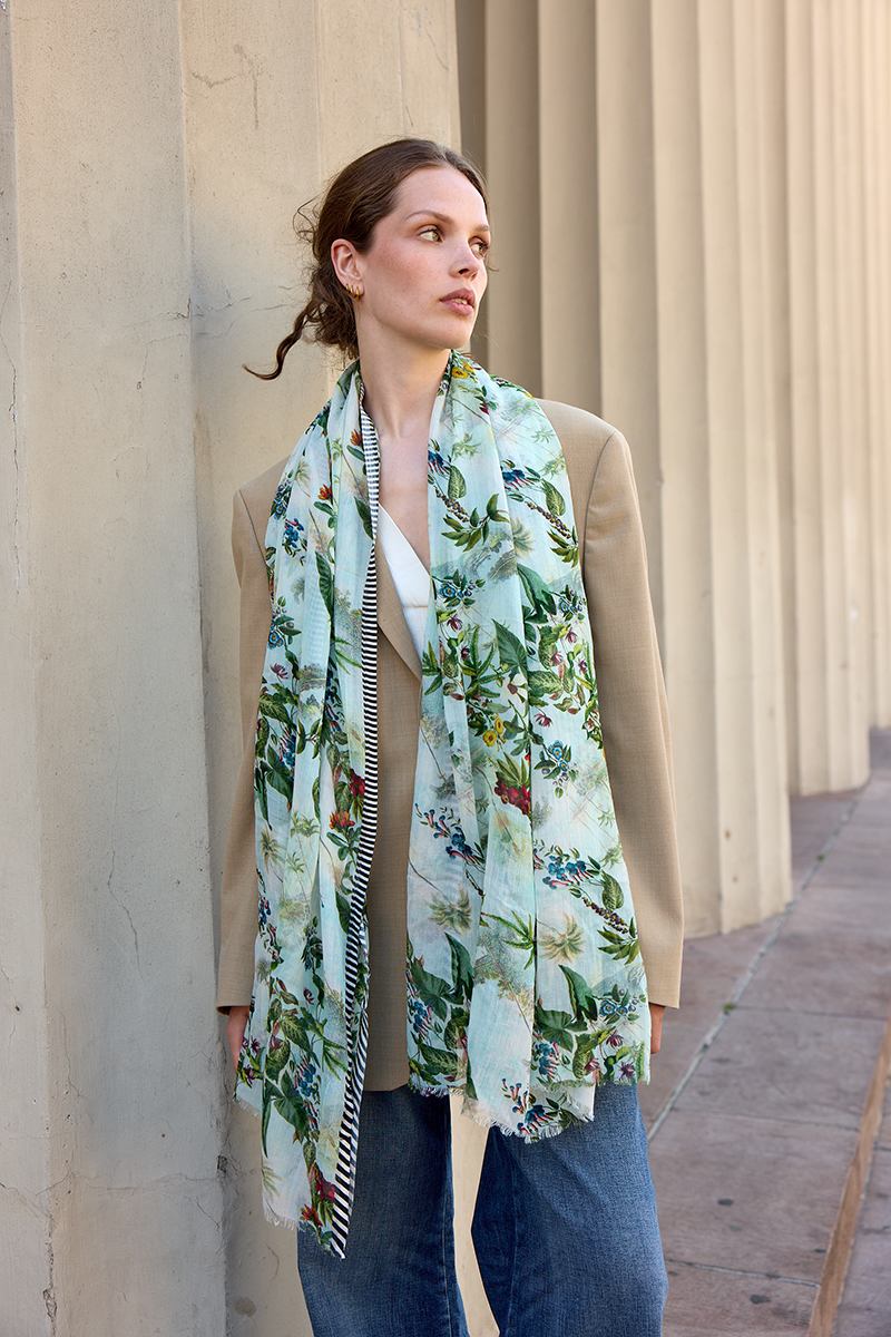 ORIENTAL Skjerfet i 50% Bomull/50% har et raffinert, orientalsk inspirert motiv med fine detaljer og harmoniske former. Det gir et elegant og sofistikert uttrykk som tilfører antrekket ditt lekenhet, karakter og tidløs sjarm.
